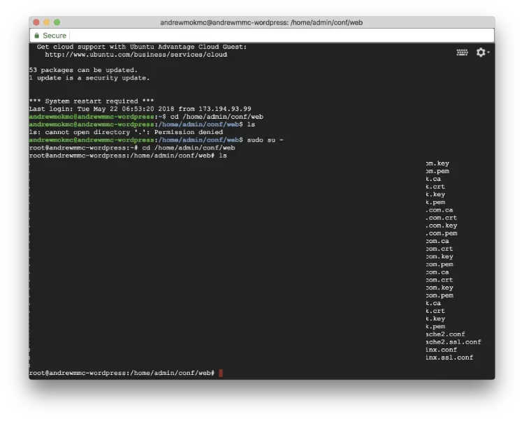 Open the console and connect to your server using SSH. Go to the directory that Let’s encrypt creates and stores the SSL certificates, and list those certificates out.