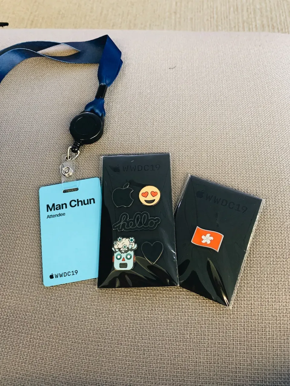 在正式開始前的一天,開發者可到會場內報到和領取證別證(Badge)。當天人流不算太多,我大概花了十分鐘,便完成整個報到註冊程序。進場後職員會分流你到不同的櫃位,你需要出示護照以報到註冊,職員亦會同時給你紀念品。今年的紀念品是一些 Emoji Pins 和一件外套。