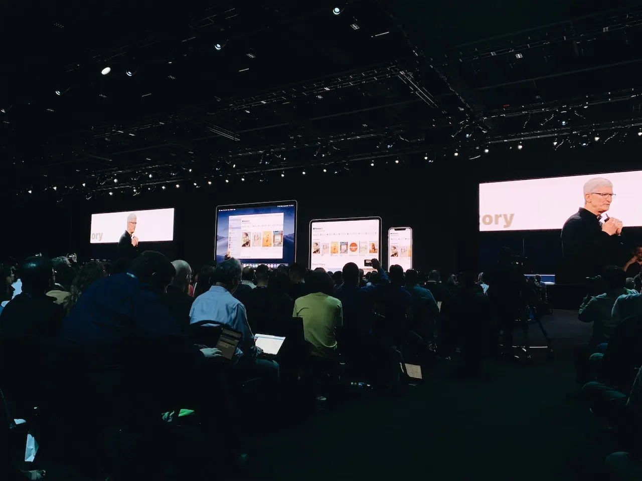 到十時正,Tim Cook 便會正式出場主持 Keynote。不同的資深工程師如 Criag 會陸續上台介紹今年的更新。十分幸運能參與到今年的 Keynote,因為今年所發佈的產品和 Framework 如 Mac Pro、iOS 13、macOS Catalina、Project Catalyst 和 SwiftUI 都可謂相當重要,稱得上是近十年最精彩的一次發佈,沒有令人失望。