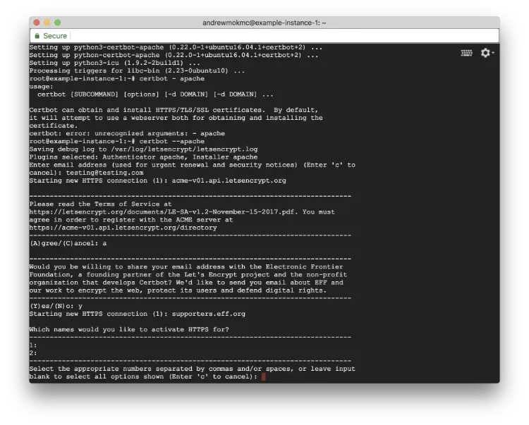 All existing domains will be listed in the terminal window. Make sure that you have already updated the DNS records pointing to your server. Simply leave blank to select all domains to activate HTTPS.