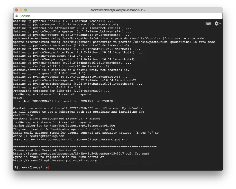 During the installation process, you may need to type your personal email and agree the terms. Simply type a to agree the Terms of Service.
