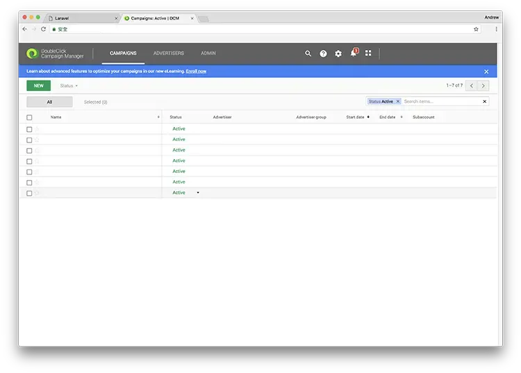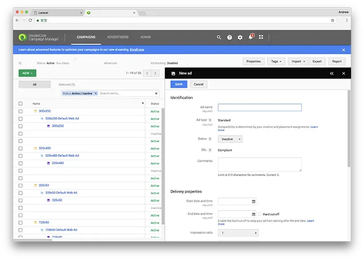 You can manage your ads and campaigns in DoubleClick Campaign Manager. Click Campaigns section, and choose a campaign that you would like to continue. If you have no campaign created before, you can click New button to create a new campaign.